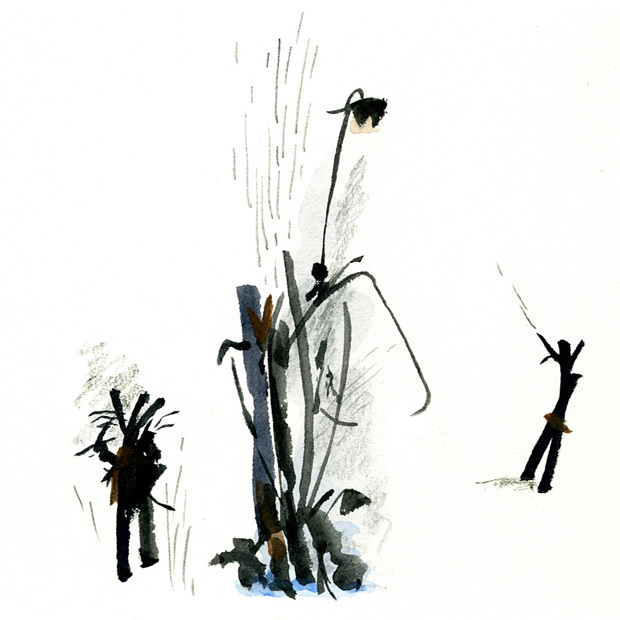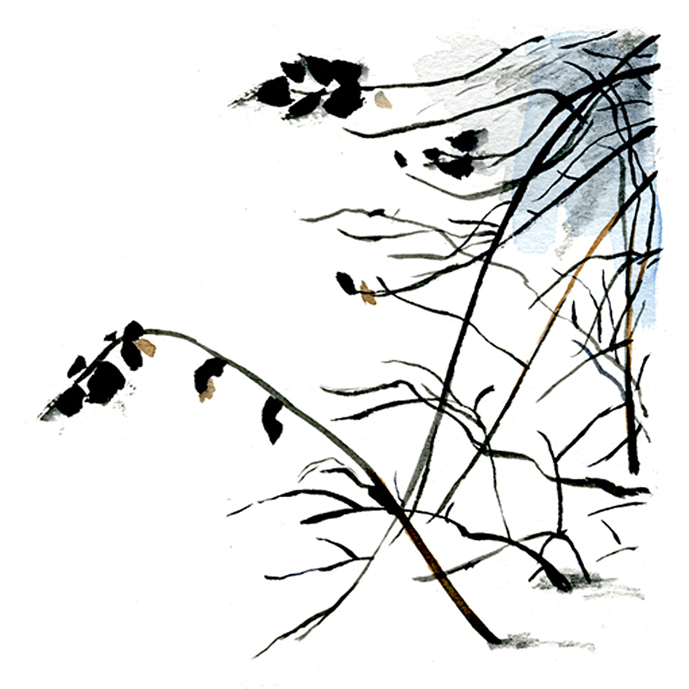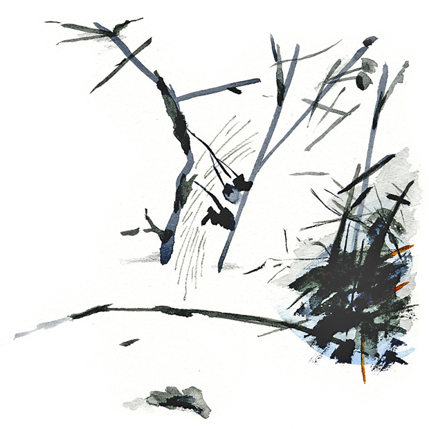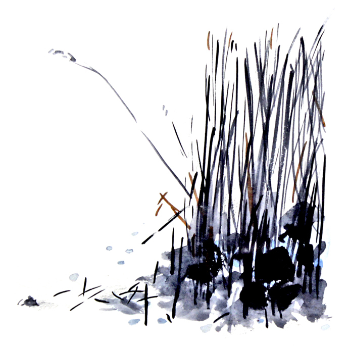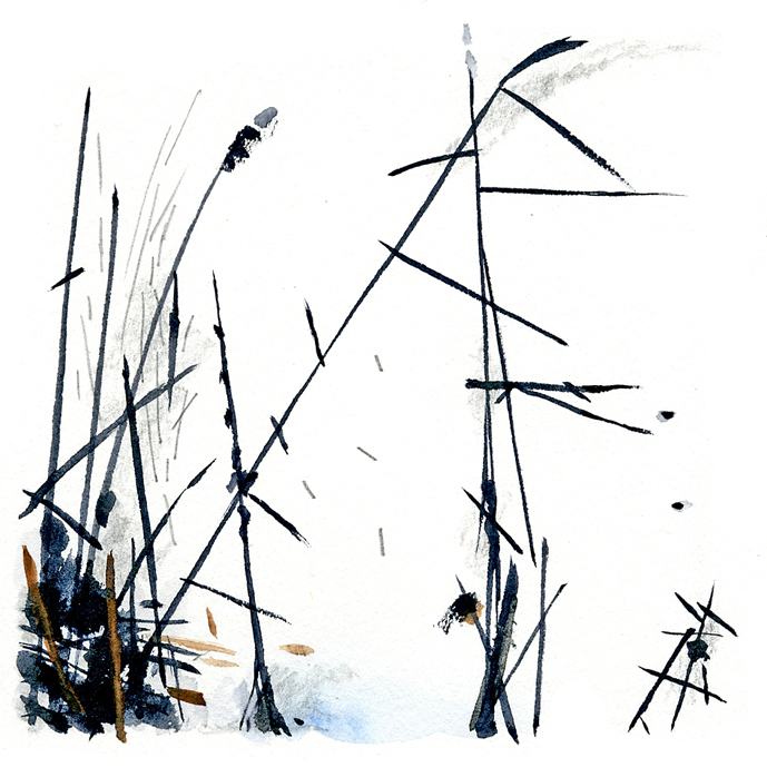 Når sneen lægger sig tykt i mit stauderbed og ved søbredden, står planternes visne stængler