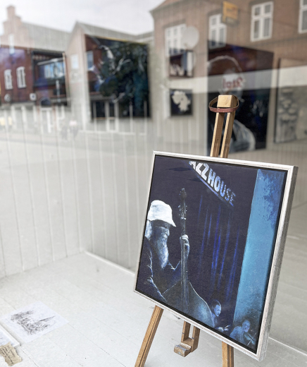 Jazzkendere vil sikkert kunne se, at det viste portræt på fotoet tv. i facadevinduet, forestiller Hugo Rasmussen, den kendte danske jazz basmusiker.