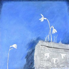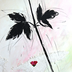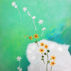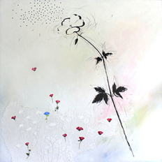 Med det sidste maleri, 90 x 90 cm, som jeg malede lige inden udstillingen, var tanken at det skulle være helt hvidt, blankt/mat. Det endte dog med, at jeg malede nogle af de pressede blomster med farve. - Kunne ikke lade være.