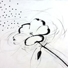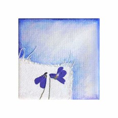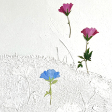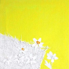 Jeg påførte stof med pressede forårsblomster, og malede derefter stoffet og flere af blomsterne hvide. På den måde er blomsterne ikke noget jeg "bare" har malet, men det er den virkelige natur som gemmer sig under malingen.